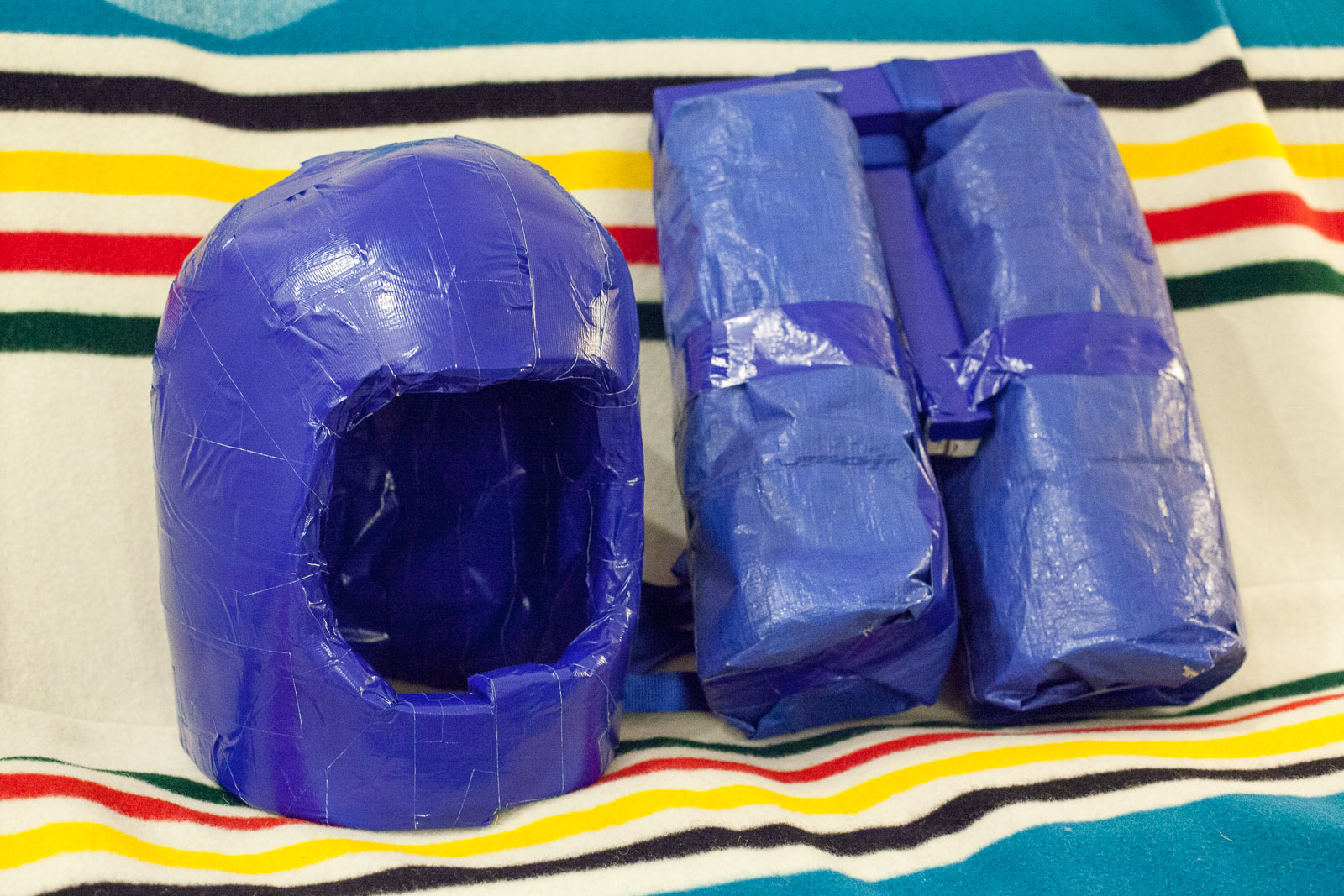 For my Benny costume, I needed a helmet. I created it using 1″ thick foam and blue Duct Tape. I made a tube, then cut the top into four even flaps, which I tapered into rounded triangles using about these proportions. I shaped the helmet by eye rather than using any measurements, which resulted in a helmet which is slightly too tall but otherwise looks great. The jetpack was a late addition, made of paper cardboard and bubble wrap, which I covered in a combination of blue tarp and duct tape. It holds on my back using blue 1″ tubular webbing which I already owned for rock climbing purposes.